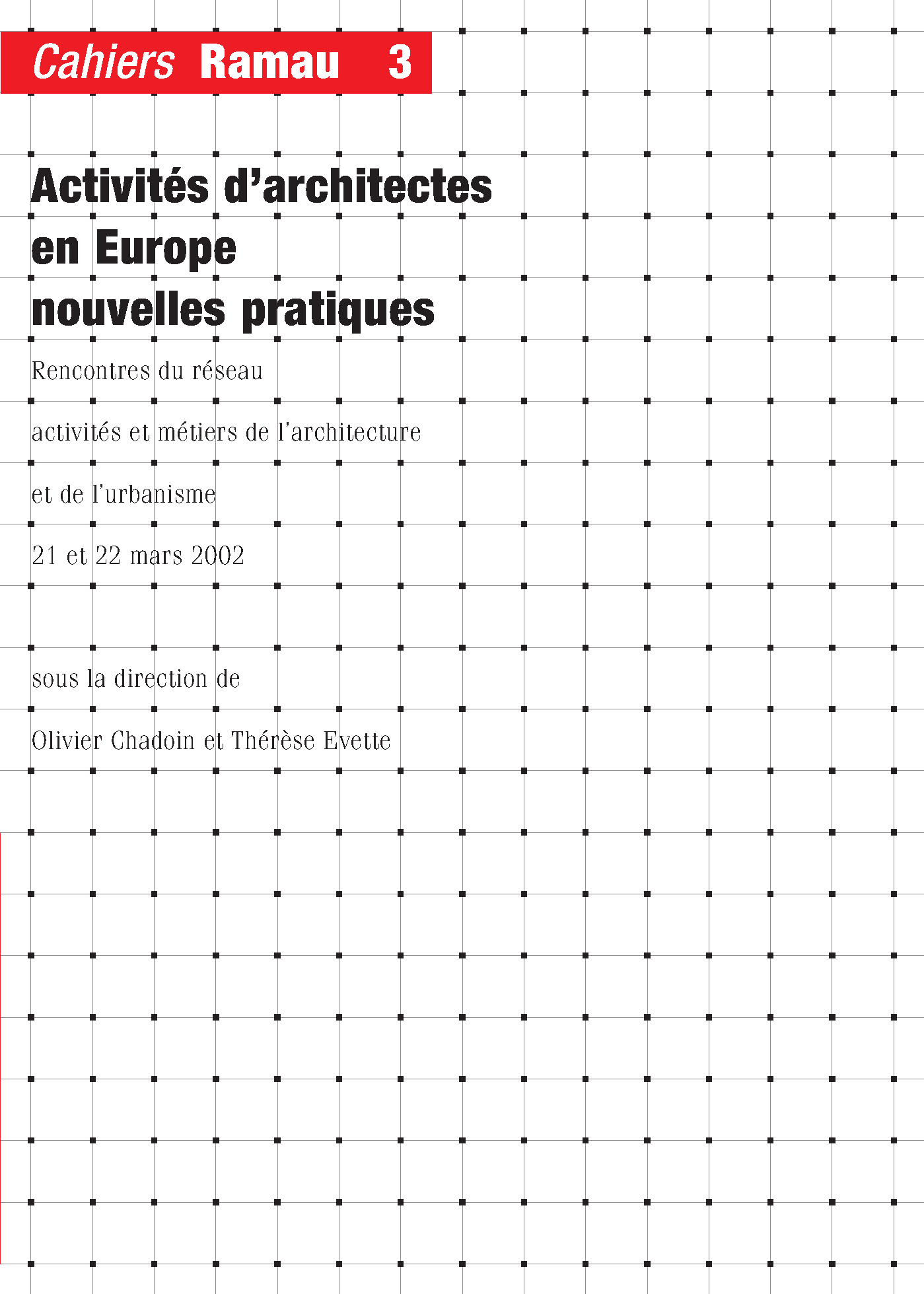 Numéros > 3 | 2004 – Activités d’architectes en Europe : nouvelles pratiques Activités d’architectes en Europe. Couverture. Cahiers RAMAU 2004 Fichier original couvramau3.jpg (image/jpeg – 418k)